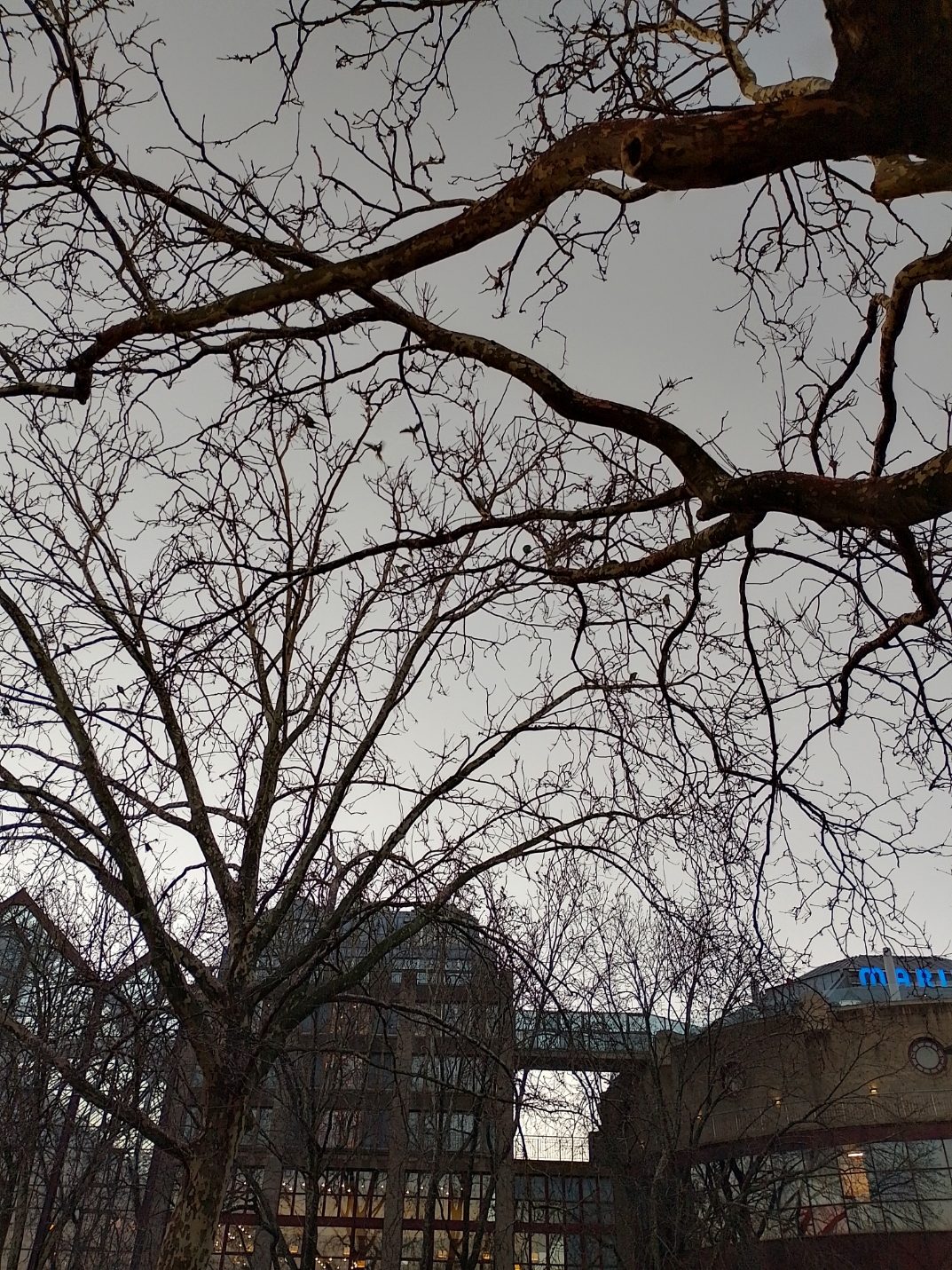 Auf einmal großes Gekrächze mannigfaltiger Natur über den Köpfen und rundum. Ein Blick nach oben. Direkt gegenüber vom Hotel Maritim colonisieren die Rheinpapageien ihre Schlafbaumwipfel mit Panoramablick. Ein Blick zur Seite. Da beziehen die Binnenmöwen ihre Schlafplätze in geordneter Reihe auf den mittlerweile verwaisten Anlegestellen der Rheinschifffahrtsgesellschaften.