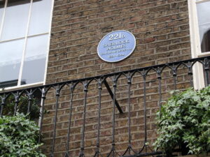 Das Museum haben wir uns gespart, aber der Shop war schon sehr gemütlich stimmungsvoll und reichte vollauf um einen Krimi-atmosphärischen Eindruck zu bekommen. Für mehr Krimiatmosphäre ist ohnehin das Krimihaus in Hillesheim in der Eifel der beste Ort, an den man fahren kann. Nachdem ich mehrere schöne Mitbringsel erworben hatte, bin ich auch gleich von dem Zerberus am Shopeingang aufgehalten worden, der mich kontrollieren wollte. Immerhin hat er ein wenig betreten dreingeschaut, als sich herausstellte, dass er da wohl das falsche Wild gestellt hatte. Eine Deerstalker-Mütze hab ich mir leider nicht gekauft, obwohl das ikonisch gewesen wäre. Sie war zu teuer für den Urlaubsbeutel. Aber immerhin habe ich mir Lesezeichen mit Sherlock-Zitaten, eine Scherenschnittgrafik mit Sherlockmotiv, gerahmte zeitgenössische Polizeiaufrufe des 19. Jhrs. und einen stabilen, großen Leinenbeutel mit Sherlock-Konterfei gegönnt, damit ich all die Einkäufe auch tragen konnte.